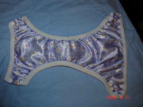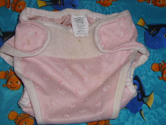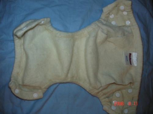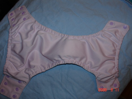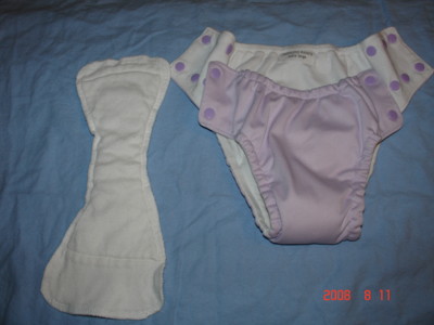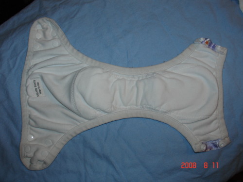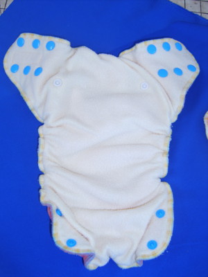 Rightous Baby AIO Fleece cover. Super Cute flower on bum. The green inside is stained, it might wash out in a better washer than what I had when my dd wore this. I think it is a Medium, my dd wore this at 18 - 22lbs. Asking $12 plus postage